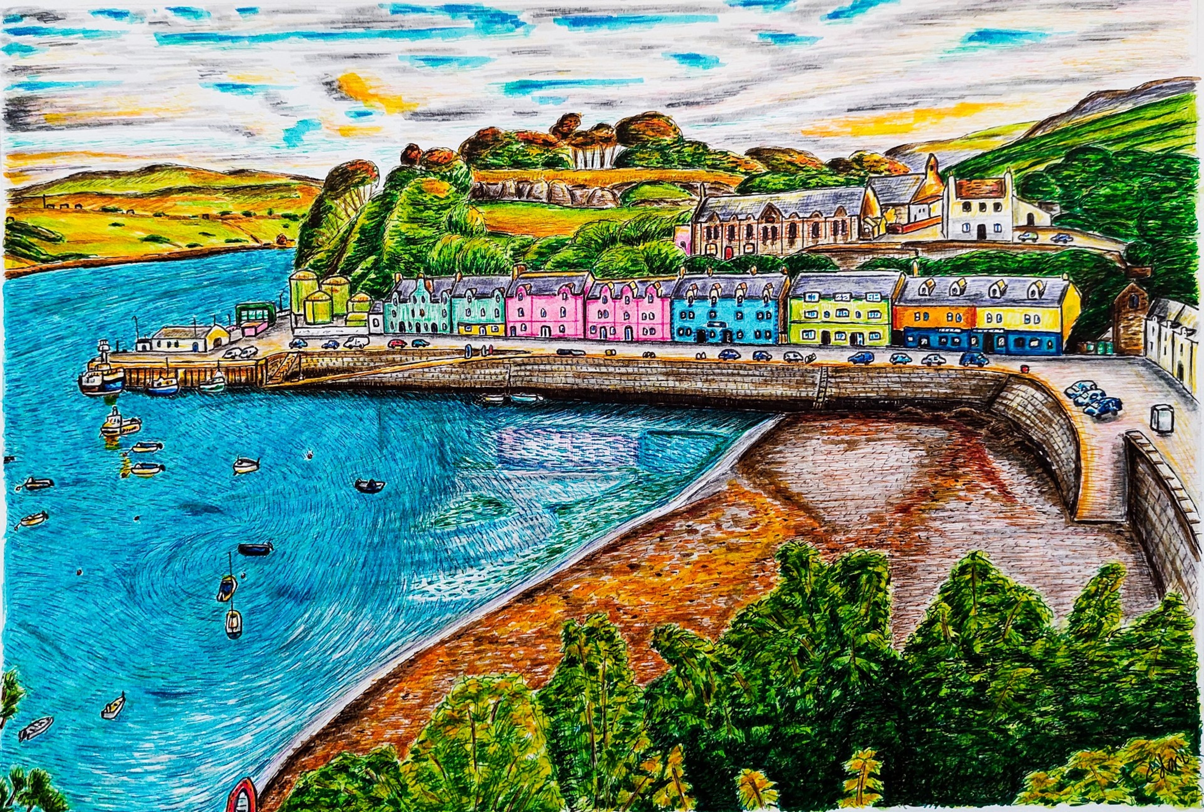 Inspired by his travels across the UK, Joe captures iconic British landscapes through intricate pen drawings, brought to life with striking, vibrant colors.