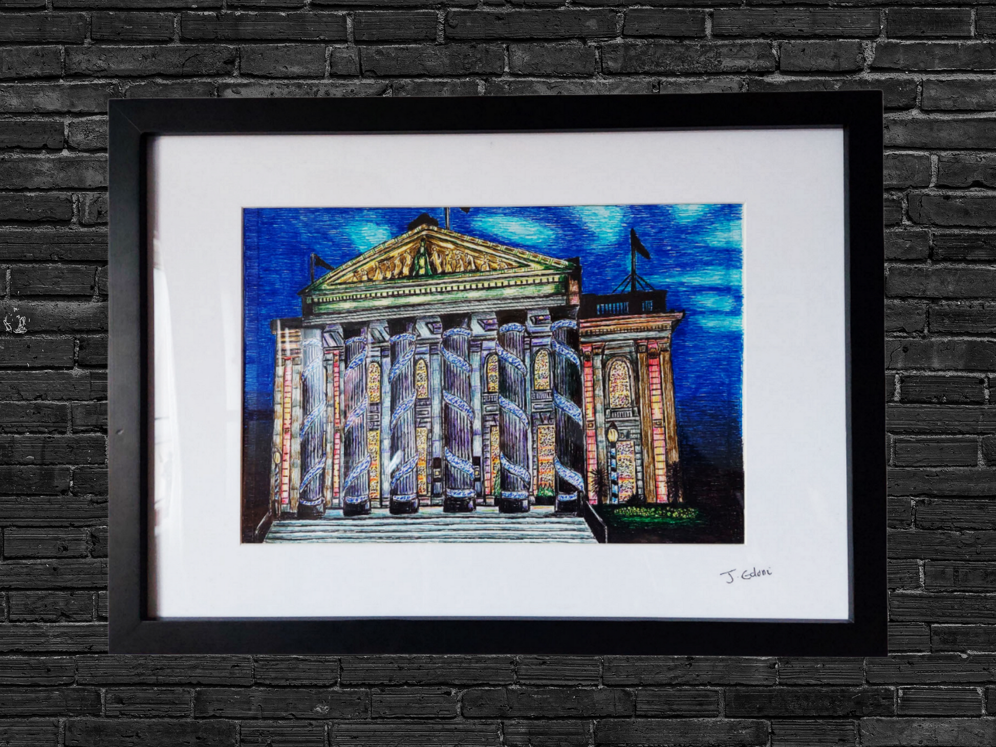 Bring a touch of Festive Edinburgh magic to your walls with this detailed artwork showcasing the iconic Dome building lit up for Xmas. Captured by artist Joe Edoni using fine tip pen with a range of vibrant colours. Ideal for travel enthusiasts, Edinburgh lovers, or anyone seeking art that radiates the festive season.