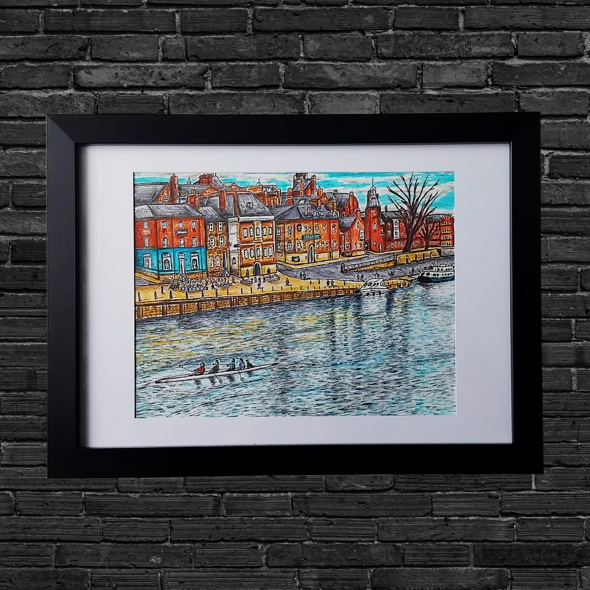 Celebrate the historic charm of York with this hand-drawn artwork of the riverfront by Glasgow artist Joe Edoni. This stunning riverfront is lined with characterful buildings, offering a glimpse into York’s medieval past. A must-have for lovers of hidden gems and classic English architecture.